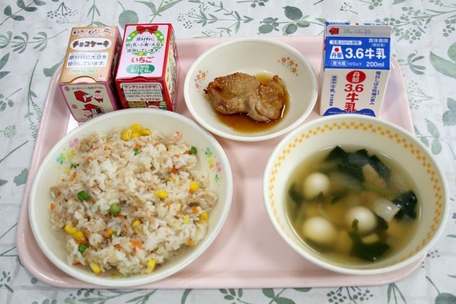 今日は、2学期最後の給食(クリスマス献立)です。メニューは、「ツナピラフ」「照り焼きチキン」「うずらの卵と野菜のスープ」「クリスマスケーキ(チョコorいちご)」「牛乳」です。ツナピラフは、お米の固さと味付けがバッチリでとても美味しくいただきました。うずらの卵と野菜のスープは、ベーコンや野菜の旨味がしっかり出ていて、こちらも大変美味しくいただきました。クリスマスケーキは、みんな喜んで食べていて、1年生はチョコまみれでした。
