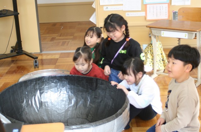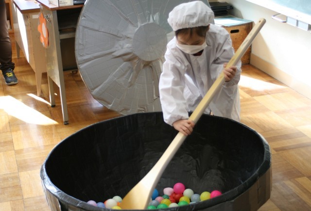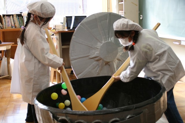 1年生は、学活で食育の授業を行いました。栄養教諭による「きゅうしょくしつのひみつ」です。普段、入ることのできない給食室の様子を、写真や動画で見せてもらいました。子供たちは、実際に給食室で使う道具を見て、家庭で使う道具との違いに驚いていました。回転釜の模型とスパテラ(木べら)を使って、給食を作る体験もしました。最後は振り返りシートを使って、調理員さんへの感謝の気持ちをどう伝えるか考えました。
