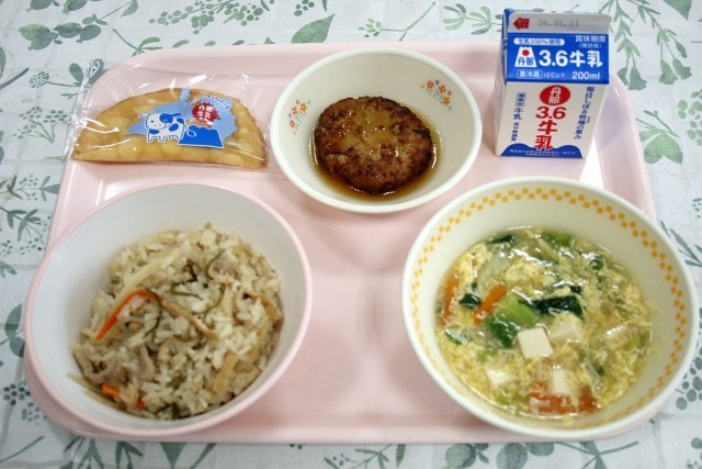 今日の給食は、「切り干し大根と豚肉のご飯」「平つくね」「かき玉汁」「丹那クレープ」「牛乳」です。切り干し大根と豚肉のご飯は、味が具材やご飯にしっかり染み込んでいて、とても美味しかったです。やっぱり戸田小中の炊き込みご飯は沼津で一番ですね!平つくねは、キャベツが多く入っているため、軟らかい食感でしたが、美味しかったです。かき玉汁は、卵や野菜がたくさん入っており、栄養たっぷりでこちらも美味しくいただきました。
