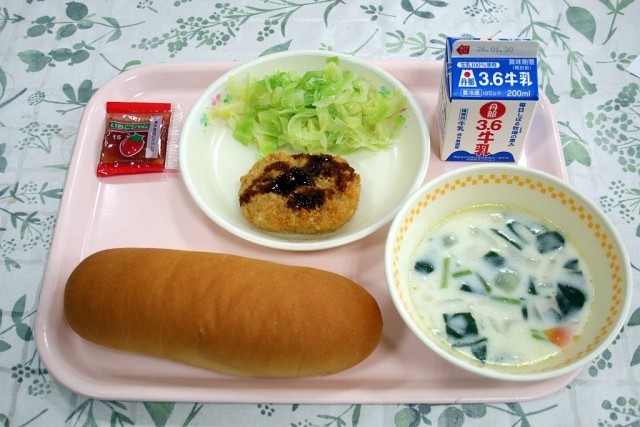 今日の給食は、「コッペパン」「野菜コロッケ」「ボイルドキャベツ」「ミルクスープ」「いちごジャム」「牛乳」です。野菜コロッケは、外はサクサクで、中はホクホクのジャガイモがたくさん入っています。ミルクスープは、鶏肉と野菜がしっかり煮込まれいて、心も体も温まる美味しいスープでした。