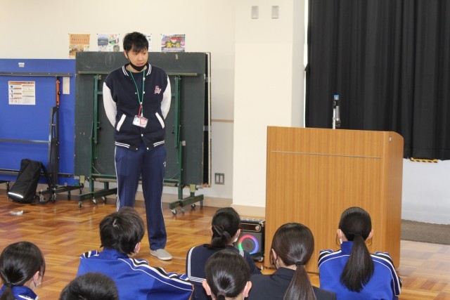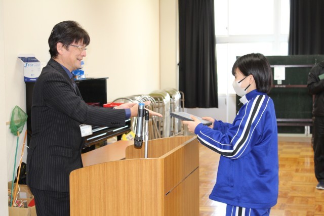8・9年生は、多目的室にて一人一台端末貸与式が行なわれました。すでに使用している旧型端末から新型端末への交換するタイミングで、校長先生から「ルールを守って大切に使ってください。」との言葉とともに各学年の代表者に貸与されました。最後に一人一台端末使用上の約束に関する動画を視聴しました。