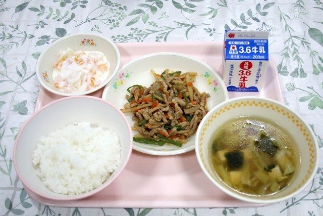 今日の給食は、「ご飯」「チンジャオロース」「わかめスープ」「ヨーグルトサラダ」「牛乳」です。チンジャオロースは、味付けも良く、シャキシャキのタケノコをはじめ、軟らかい肉や野菜が相まって、とても美味しかったです。わかめスープは、中華だしが利いていて、ほどよい食感の豆腐がとても美味しかったです。ヨーグルトサラダは、サラダと言えども、デザートとしてみんな喜んで食べていました。