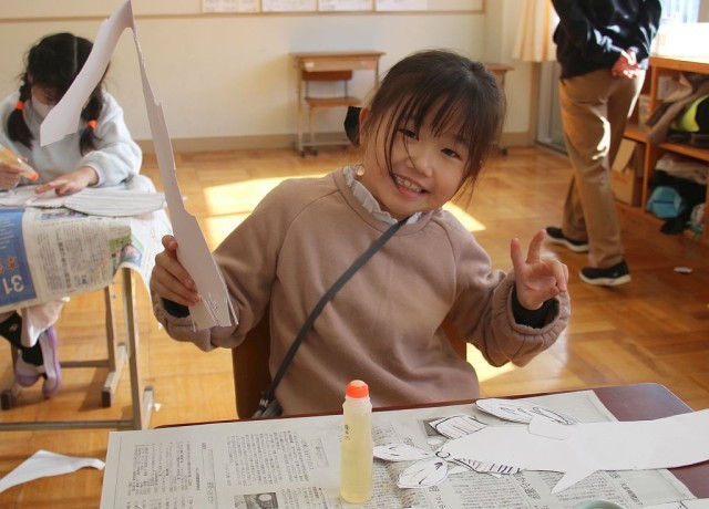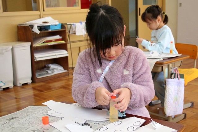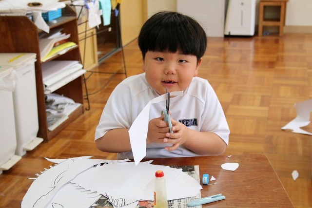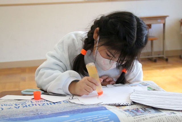1年生の図工では、「紙版画づくり」を行っています。戸田にちなんで、お魚の版画づくりのようです。器用にはさみを使って画用紙を切り取り、丁寧にのりで貼り付けながら作品を仕上げていきます。どんな素敵なお魚の版画が完成するか楽しみです。