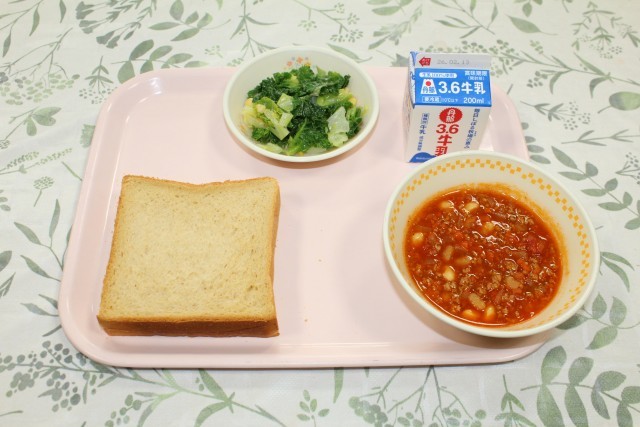 今日の給食は、「チリコンカン」「黒糖パン」「プチヴェールのサラダ」「牛乳」です。サラダの中に入っているプチヴェールはケールと芽キャベツを交配して生まれた珍しい野菜で、栄養豊富で甘みがあるのが特徴です。地産地消ということで沼津で生産されたものを使用しています。