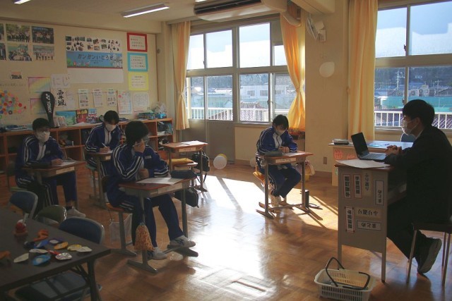 本日は、路面凍結によるチェーン規制の影響で、一部の教職員が登庁できないため、対応できる職員で一部カリキュラムを変更して授業を行っています。9年生は、予定通りに1時間目から数学の授業ができています。内容は、入試対策としてのプリントをテスト形式で行っています。
