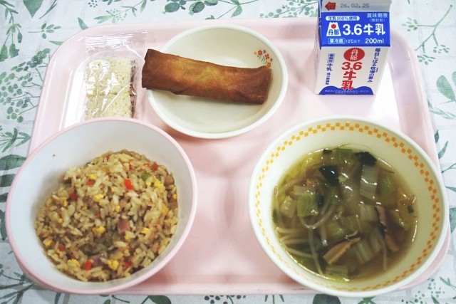今日の給食は、「炊き込みチャーハン」「春巻き」「お焦げの中華スープ」「牛乳」です。炊き込みチャーハンは、お米や具材の固さがちょうどよく、味付けも完璧で、大変美味しかったです。春巻きは、外はパリパリ、中はとろとろジューシーでした。お焦げの中華スープは、袋に入ったお焦げを割ってからスープに入れ、野菜と一緒に食べました。