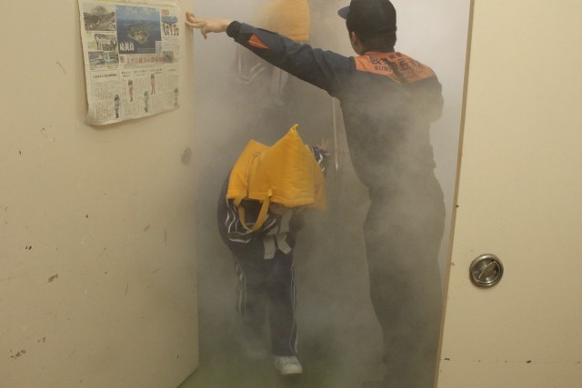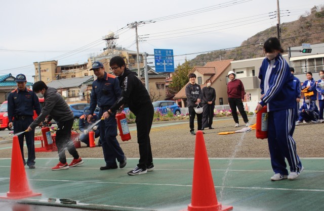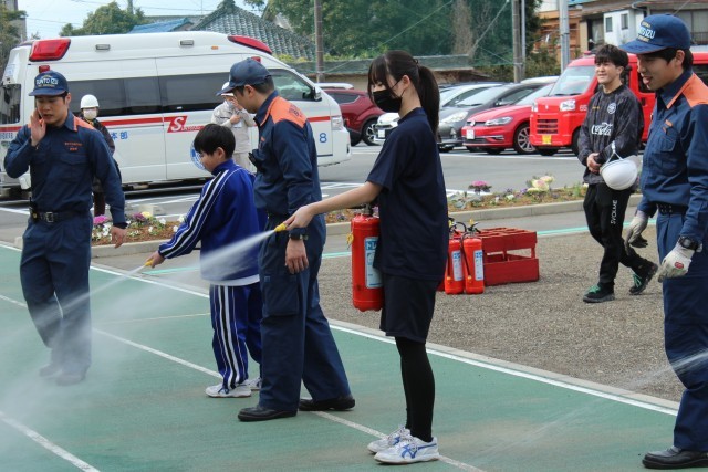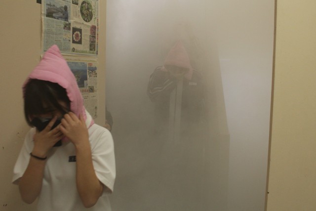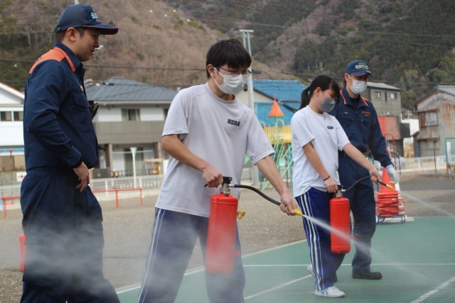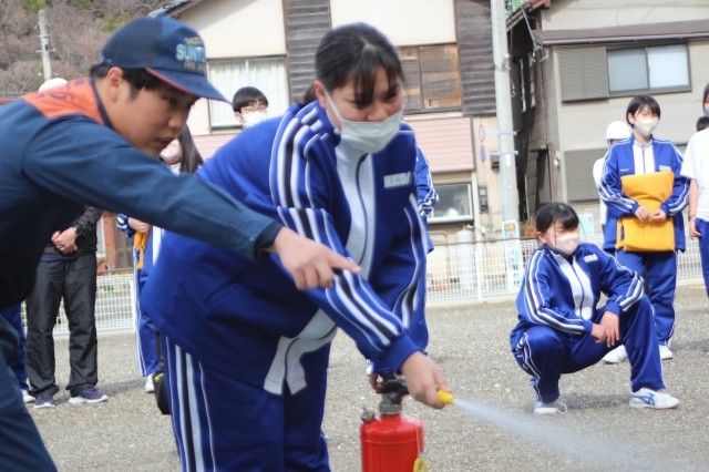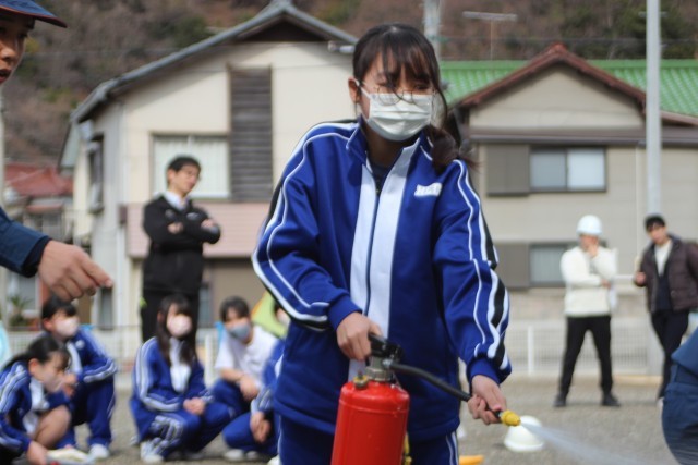今日は給食室から出火したという想定で、火災避難訓練を行いました。沼津南消防署戸田出張所の協力のもと、スモークマシンを使って煙の中で階段を降りる訓練をしました。煙の中では、視界がとても悪くなることを感じることができました。避難訓練の後、中学生は水消火器を使った消火訓練も行いました。火事が起こらないことが一番ですが、いざというときは、今日の訓練を思い出して落ち着いて避難できるといいですね。