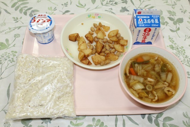 今日の給食は、「うどん」「ちゃんこうどん」「大豆とポテトの唐揚げ」「ヨーグルト」「牛乳」です。「ちゃんこ鍋」などで有名な「ちゃんこ」という言葉の由来には、「ちゃん」は父親・親方、「こ」は子・弟子を意味し、「親方と弟子が共に食べる料理」というものや、中国語の「鍋(こう)」から転じたなど諸説ありますが、いずれにせよ相撲部屋で力士の体作りのために考案されたものであり、栄養のバランスを整えるのに非常によい料理です。