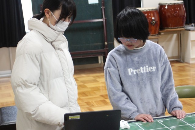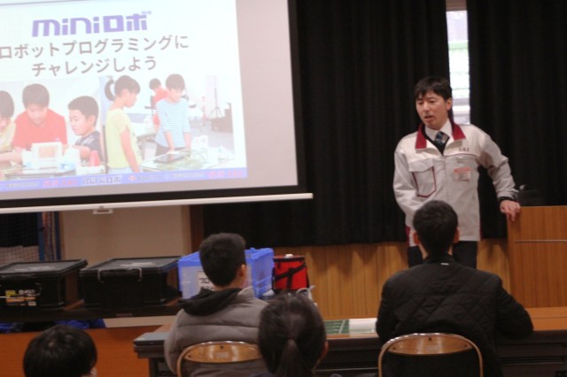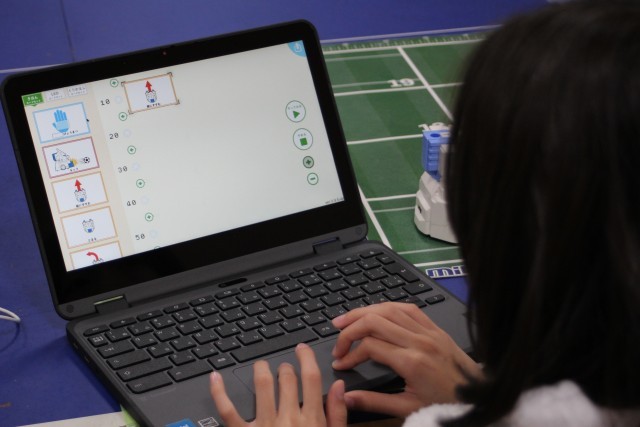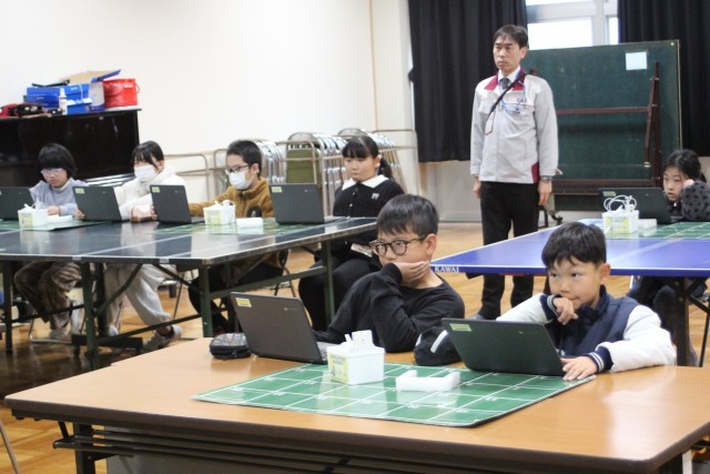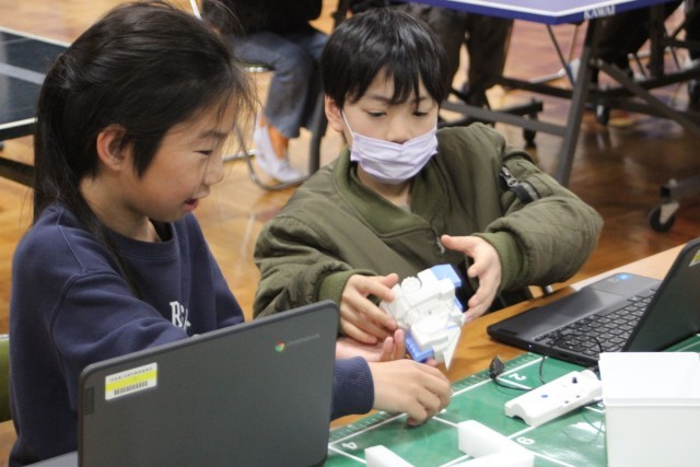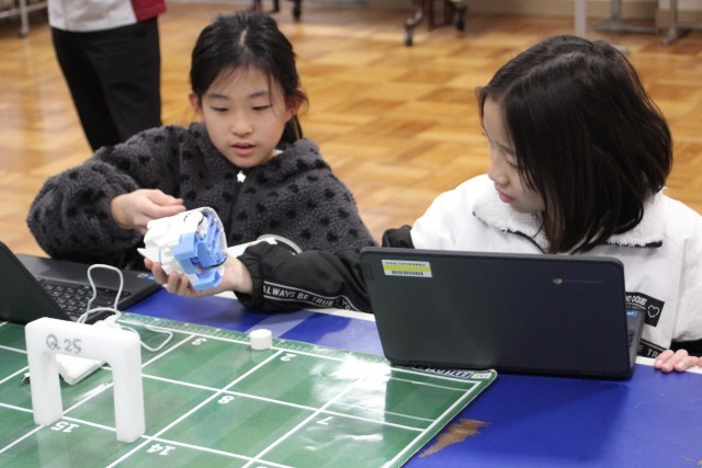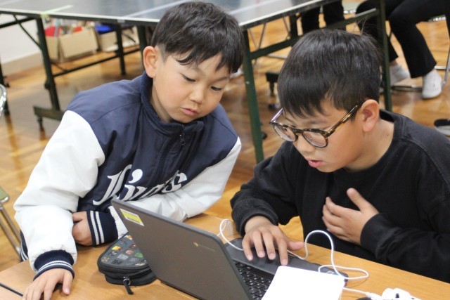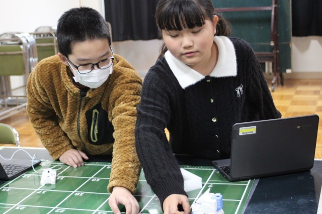 今日、3~6年生はプログラミング教室を行いました。講師として株式会社アイエイアイの方に来ていただき、ミニロボを使ったプログラミングの基礎を学びました。子供たちは、自分のプログラミングで動くロボットに夢中です。ペアで相談し、思い通りに動かせるように試行錯誤を繰り返しました。中には0.01秒の正確さにこだわり、プログラムを調整する子もいました。プログラミングの難しさと楽しさを学べる有意義な時間となりました。この中から日本の産業を支えるプログラマーが誕生するかもしれませんね。