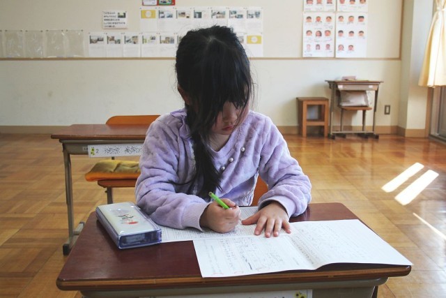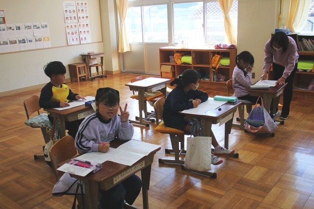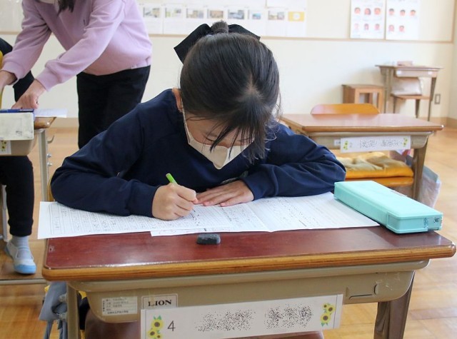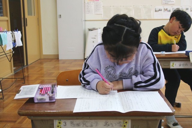 1年生の国語では、「1年間の思い出を振り返ろう」を学習問題として、授業が進められています。児童たちは今年度の思い出を振り返りながら、作文を一生懸命書いていました。