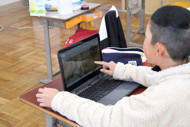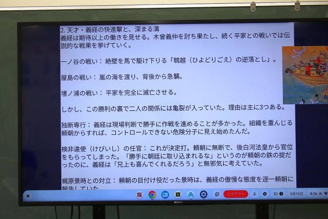 6年生の社会では、これまで学んできた歴史・地理・公民の中から、自分が一番興味のあることをChromebookにまとめ発表していました。児童たちは、「清少納言」、「千利休」、「源頼朝と源義経」について、それぞれ大変良く調べられていたので感心させられました。