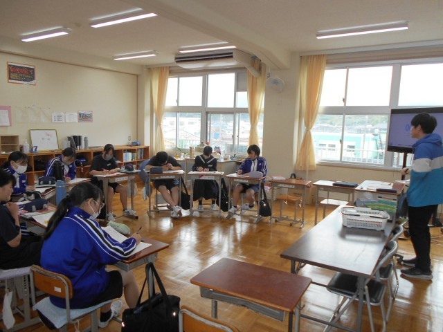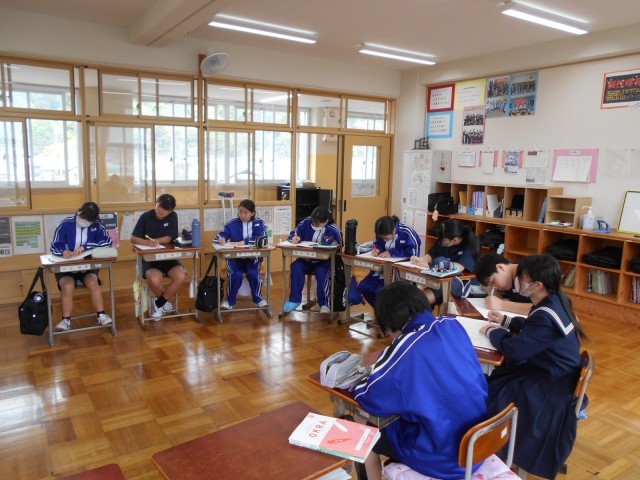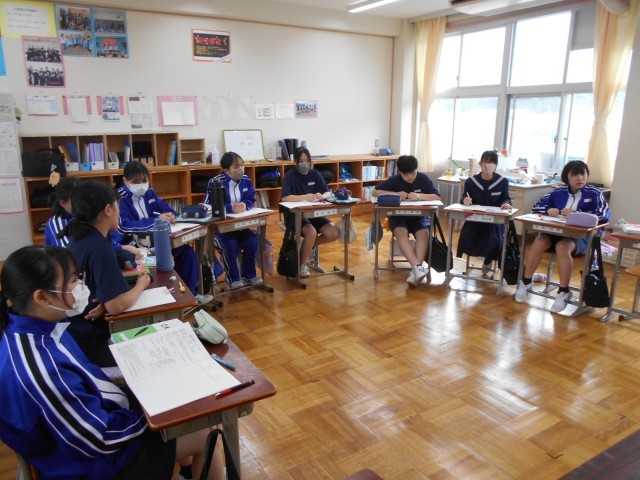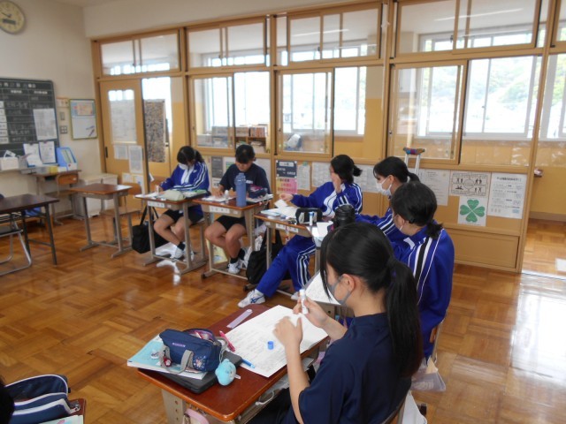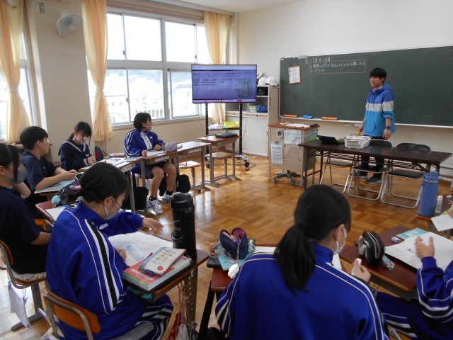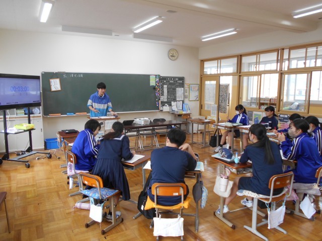 8年生は、数学の時間で文字を用いた計算について学んでいました。「2種類の文字があるとき、どのように分類したらいだろうか」という学習問題から、正四角柱の面積や体積などを求める式から、2種類の文字を用いる式について考えていました。
