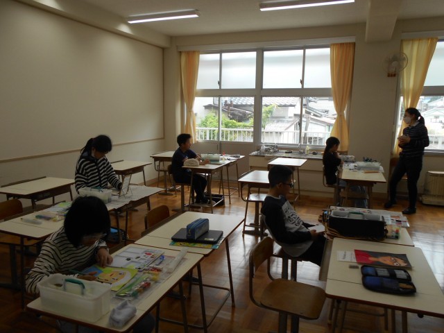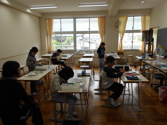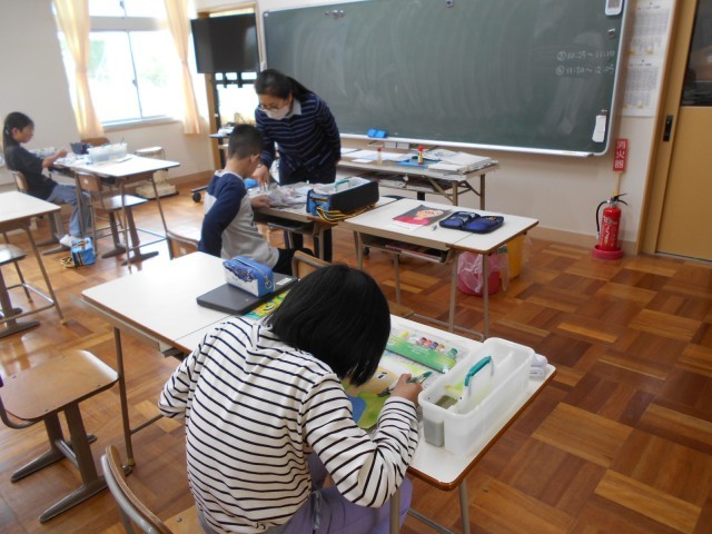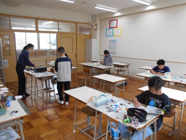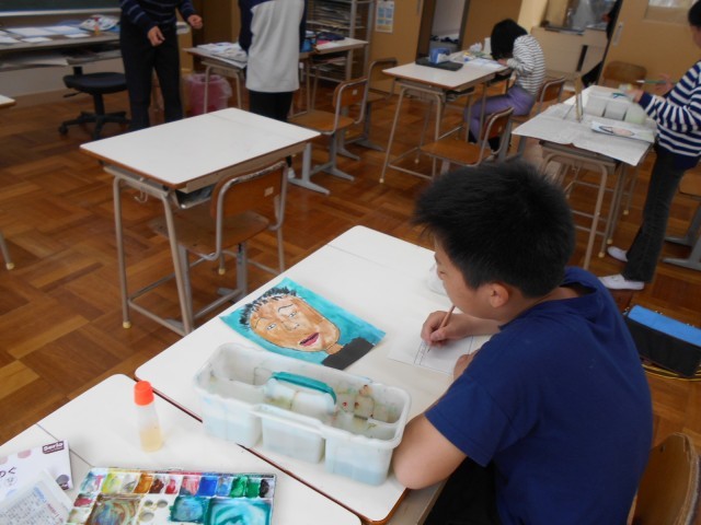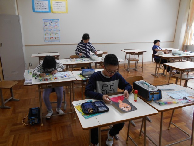 5年生は、図画工作の時間で自画像について学んでいました。顔や髪の毛の色をていねいにぬったり、名札に題名や工夫したことなどを書いたりしていました。