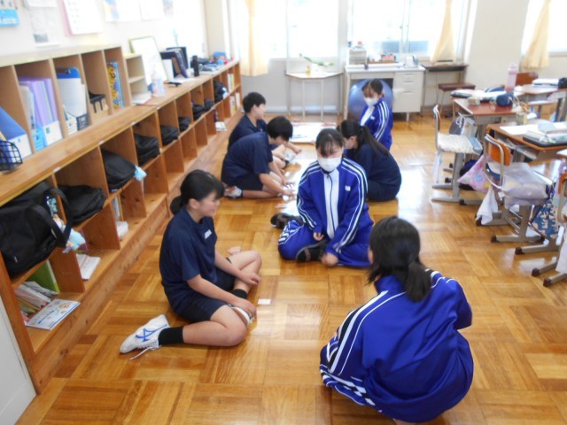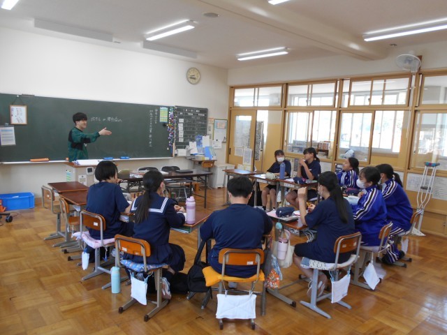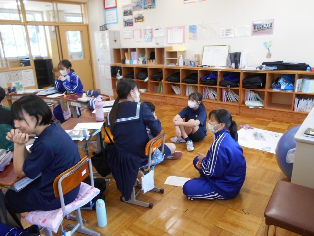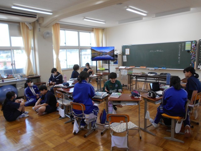8年生は、国語の時間に詩をつくることに取り組んでいました。授業の導入では、百人一首の札を取り合ったり、「ホテルか車中泊か」という子どもから出された題について、意見を交わしたりしていました。