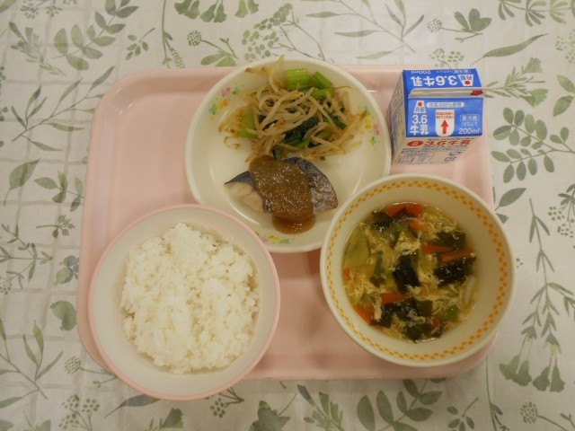 今日の給食は、「ご飯」「さわらのごまみそがけ」「おひたし」「かきたま汁」「牛乳」です。さわらにかかっているごまみその味が絶品で、さわらをもう一枚食べたくなりました。