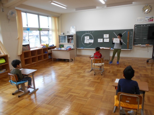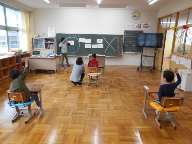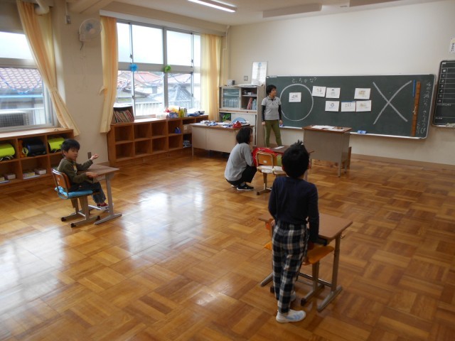 1年生は、学級活動の時間に「生活の決まり」について学んでいました。休み時間の過ごし方など具体的な生活の場面について、○と×の「どっちかな?」と考えることを通し、その理由を発表したり、友達と楽しく過ごす方法について意見を出し合ったしたりしていました。