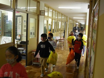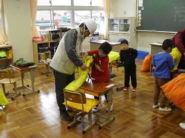 本日は、雨のため避難訓練を雨天バージョンで実施しました。入学したばかりの1年生も学級担任の話をしっかりと聞きながら行動することができました。終了後は、ライフジャケットを袋にしまって、元の場所に返却し、本日の訓練を終えrことができました。