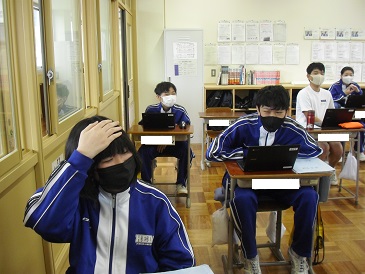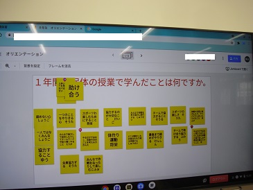 8年生は保健体育の時間でした。オリエンテーションとして、最初にChromebook(クロームブック)を使って、昨年1年間で学んだことを確認していました。
