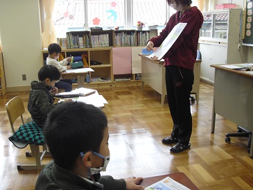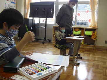 1年生は算数の時間でした。学級担任と一緒に教科書を読みながら、問いに答えていました。