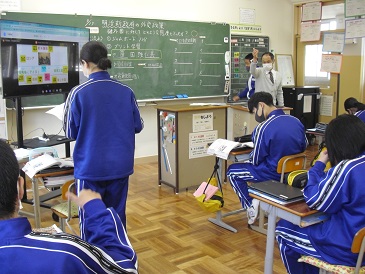 9年生は社会の時間でした。「明治新政府の外交政策」について、教科書や資料集、Chromebook(クロームブック)を使って調べていました。