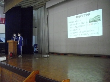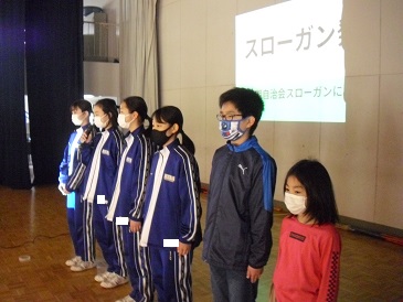 今朝、体育館で全校集会を行いました。児童生徒同士で挨拶を交わした後、自治会役員からスローガン発表がありました。
