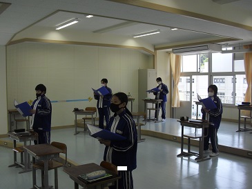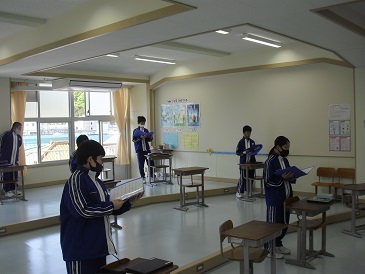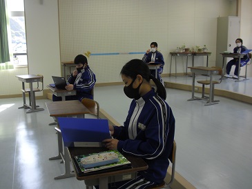 7年生は、校歌「戸田の風」の合唱練習をしていました。最初にChromebook(クロームブック)を使って、9年生の合唱の様子を鑑賞した後に、合唱を行いました。