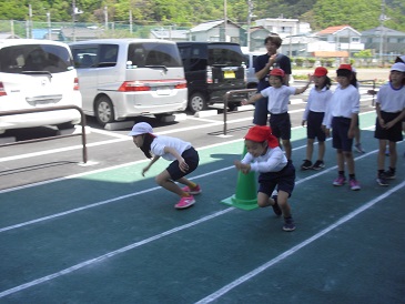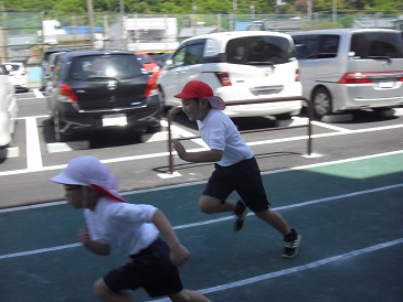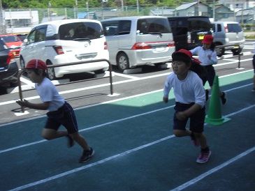 3・4年生は合同体育の時間でした。ゲーム形式の短距離走を行っていました。