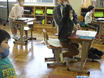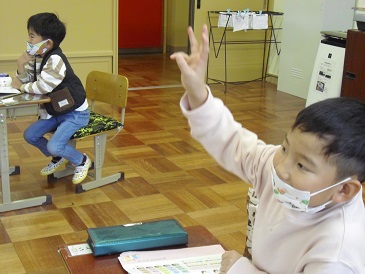 1年生は国語の時間でした。今日は「ひらがなひろば」という教材を学習していました。授業ルールをしっかりと身につけ、賛成や付け足しの際にハンドサインをしていました。