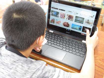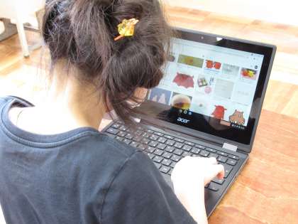 海の生き物の絵をかくために、まず本物の写真をよく見ています。色や形の細かいところまでを絵に表すことができるでしょうか。