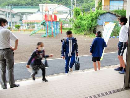 うっすら雨が落ちています。子どもたちは今日も元気に登校しました。