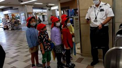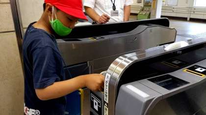 沼津駅での様子です。自動改札装置にキップを入れて、駅構内に入退場する体験もしています。