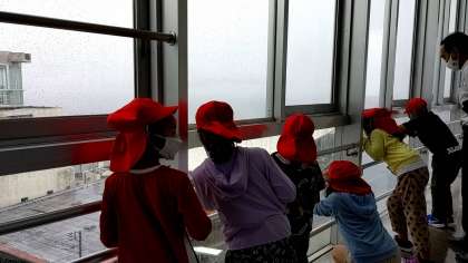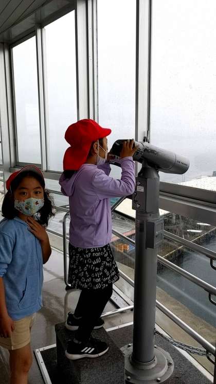 「沼津港大型展望水門びゅうお」に到着しました。びゅうおは、静岡県が津波対策として建設した日本最大級の水門です。地上30mにある展望施設から景色を眺めています。