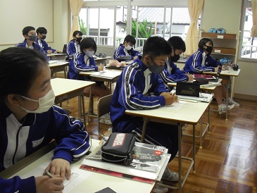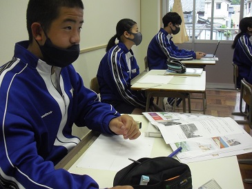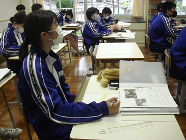 9年生は美術の時間でした。遠近法について学んでいます。一点透視図法と二点透視図法の書き方について確認しました。