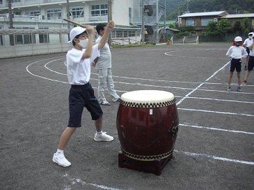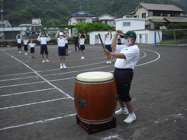 応援練習の様子です。太鼓担当の生徒が力強く太鼓をたたいています。