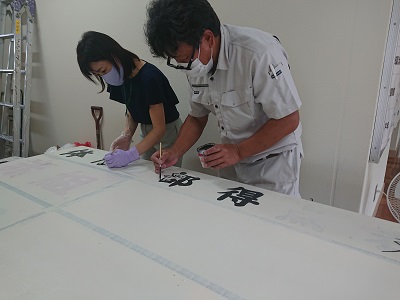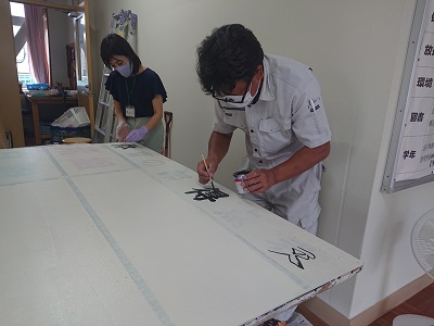 潮風祭体育の部に向けて、用務員さんとスクールサポートスタッフさんが得点板を新しくしています。