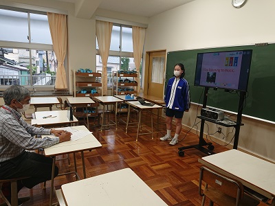 9年は言語科「英語の時間」でした。ALTにChromebook(クロームブック)を使いながら、英語でプレゼンテーションをしました。