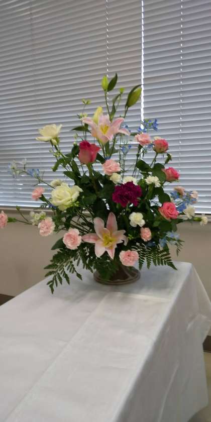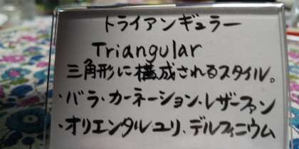 小池先生が、ヨーロピアンフラワーアレンジメント「トライアンギュラー」を子どもたちに見てもらえるよう準備しました。このアレンジメントは三角形に構成されるスタイルで、バラ、カーネーション、ゆりなど初夏の花を上手く組み合わせています。ありがとうございました。