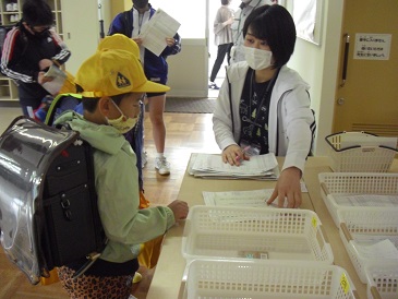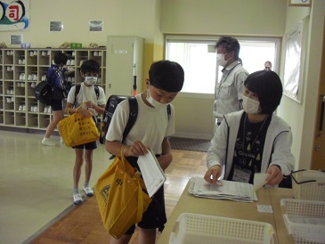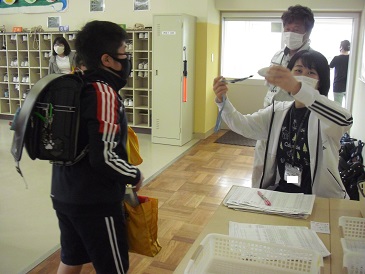 登校してきた児童生徒は、玄関で出迎える養護教諭に健康観察カードを提出すると共に健康状況の確認をします。