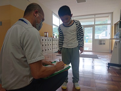 1年生は生活科の学習で、「先生のサインをもらおうミッション」に取り組んでいます。校長室や職員室など、いろいろな教室へ出かけ、出会った先生方に自分の名前を言った後、先生方からサインをもらう活動をしていました。