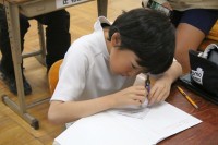 3・4年生は算数で「わたり授業」を行いました。「わたり授業」とは、教室の前後に黒板を用意し、2つの学年が背中合わせになる形で座席を配置して、それぞれ違う内容の授業を進めていくことです。3年生も4年生も、今日の目標を意識しながら活動を進めました。