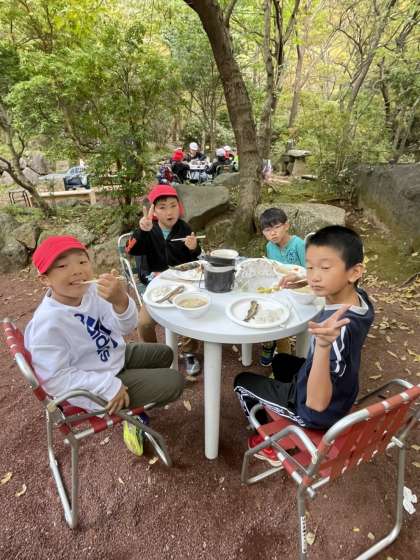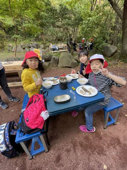 はかま滝体験活動でのお昼ご飯の様子です。戸田森林組合の皆様のサポートもあり、スムーズに準備ができました。