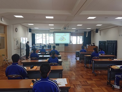 9年生は、総合的な学習「生き方学習」において、「福祉について学ぼう」というテーマで学習を進めています。今日は、戸田デイサービスセンター、三浦・戸田地域包括支援センター、沼津市役所の職員をお招きし、福祉講座「高齢者福祉について学ぼう」を開きました。