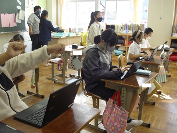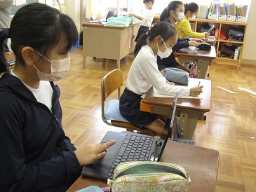 5年生は朝活動の時間において、課題提出等を終えた子からChromebook(クロームブック)でタイピング練習をしていました。
