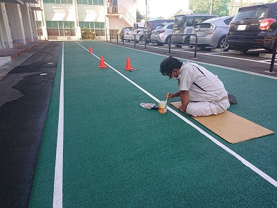 用務員さんが校内環境整備に努めています。校舎北側のグリーントラックにラインをペイントしていました。