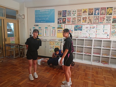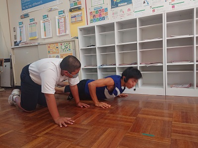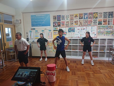 朝の時間、健康委員会が主催し、5年生以上で「マッスルトレーニング」を行いました。各クラスをオンラインで結び、みんなで体を動かしました。マッスルリーダーの直伝です。