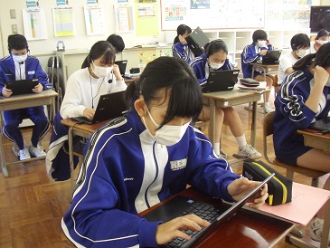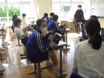 9年生は英語で「Unit5」を学習しています。今日は、Chromebook(クロームブック)を使って、英文を音読する練習を行いました。さらに音読したものを録音し、友達と評価し合いました。