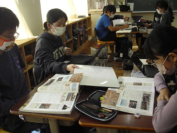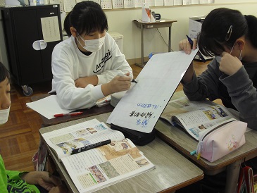 6年生は社会で「江戸時代」について学習しています。今日は、江戸時代の人々が楽しんだ文化(歌舞伎、浮世絵、食文化、蘭学など)について、グループになって教科書や資料集、Chromebook(クロームブック)を使って調べ学習をしました。