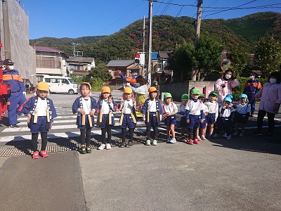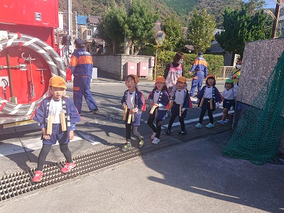 本日、へだっこセンターの園児防火パレードが行われました。園児が拍子木を打ちながら練り歩き、火災予防を呼び掛けていました。校舎北側の県道では、本校に向かって「火の用心 マッチ1本火事のもと」と大きな声で呼びかけてくれました。