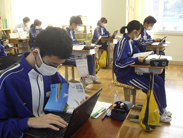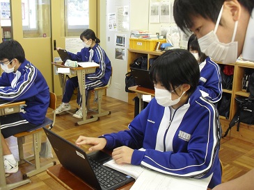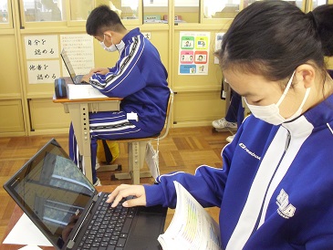 9年生は国語で「情報社会を生きる」という教材を学習しています。今日は、「筆者はどのように文章を構成し、主張を述べているか」という学習課題のもと、Chromebook(クロームブック)に自分の意見を書き込み共有しました。