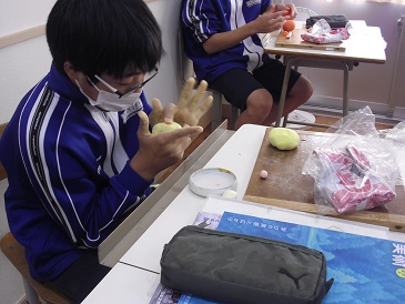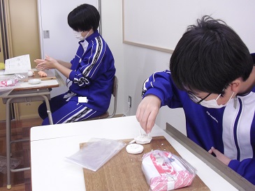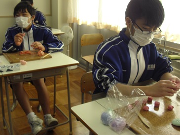 8年生は美術で「和菓子を作成しよう」という教材を学習しています。これまで作成した和菓子のパッケージに入れるお菓子を紙粘土で作成しています。